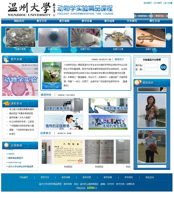 我公司為溫州大學(xué)生命與環(huán)境科學(xué)學(xué)院,建立的動(dòng)物學(xué)實(shí)驗(yàn)精品課程網(wǎng) 經(jīng)浙江省教育廳評(píng)審,被評(píng)為浙江省高等學(xué)校省級(jí)精品課程網(wǎng)站。這也是我公司開(kāi)創(chuàng)了第一個(gè)省級(jí)精品課程網(wǎng)。同時(shí)也慶祝公司在精品課程網(wǎng)站制作方面更上一個(gè)新的臺(tái)階,同時(shí)希望以后能夠?yàn)楦叩仍盒7?wù),創(chuàng)立更好的網(wǎng)站。